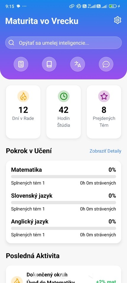 Nový spôsob prípravy na maturitnú skúšku - Aplikácia „Maturita vo Vrecku“ reaguje na nedostatok komplexných digitálnych pomôcok zameraných výhradne na maturitné skúšky a obmedzený prístup k prehľadne spracovaným zdrojom. Predstavuje nový spôsob prípravy na maturitnú skúšku.