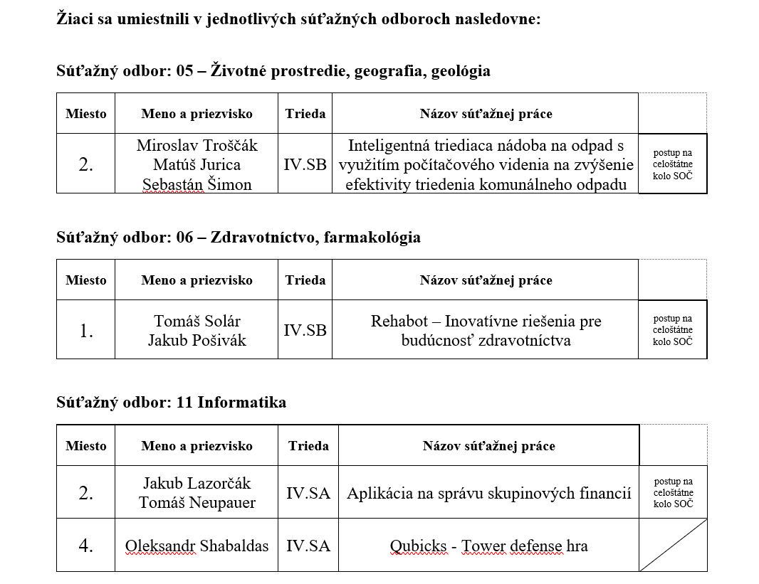 Všetkým zúčastneným žiakom, ktorí reprezentovali našu školu na krajskej prehliadke SOČ ďakujeme za ich čas, snahu a účasť na tejto prehliadke. Zároveň chceme zaželať všetkým postupujúcim do celoštátnej prehliadky SOČ veľa šťastia a úspechov!