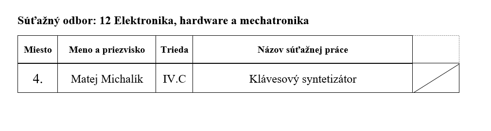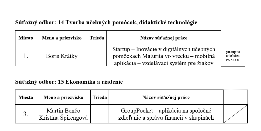 V kategórii 14 Tvorba učebných pomôcok a didaktické technológie vynikol na 1. mieste žiak Boris Kratky, z triedy IV. SC s projektom s názvom „STARTUP – INOVÁCIE V DIGITÁLNYCH UČEBNÝCH POMÔCKACH“. Výsledkom jeho ročníkového projektu a praktickej časti odbornej zložky je moderná digitálna platforma „Maturita vo Vrecku“.