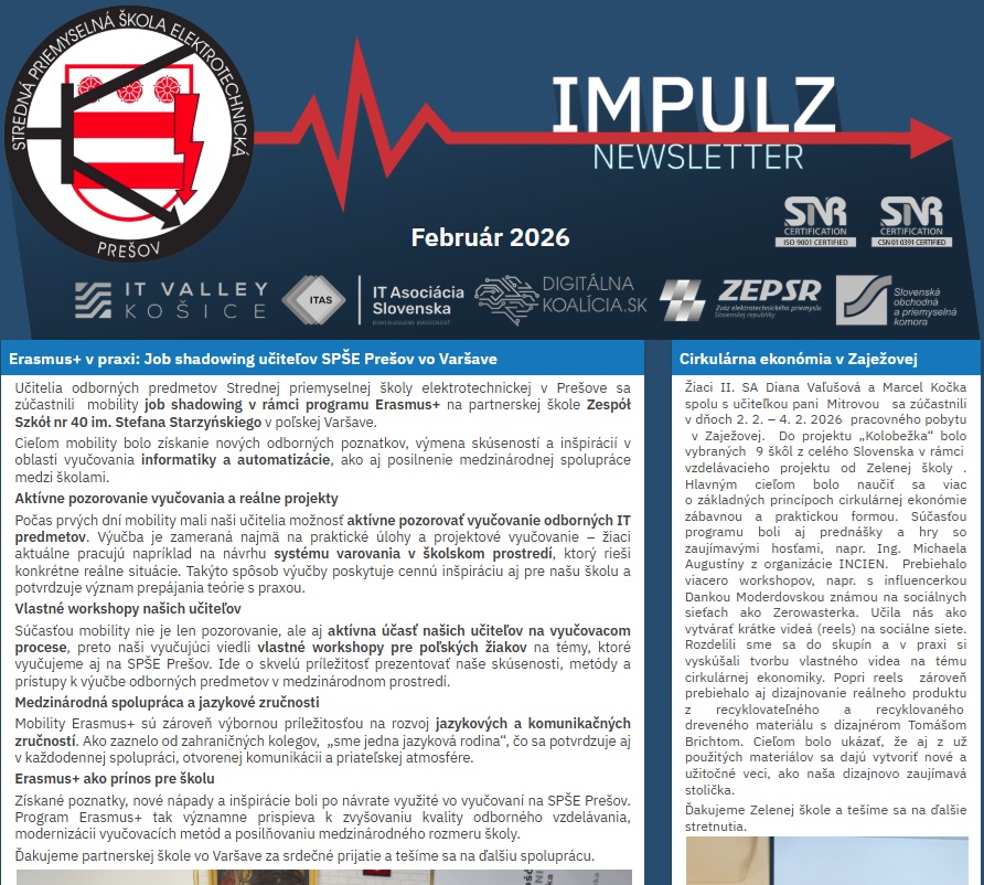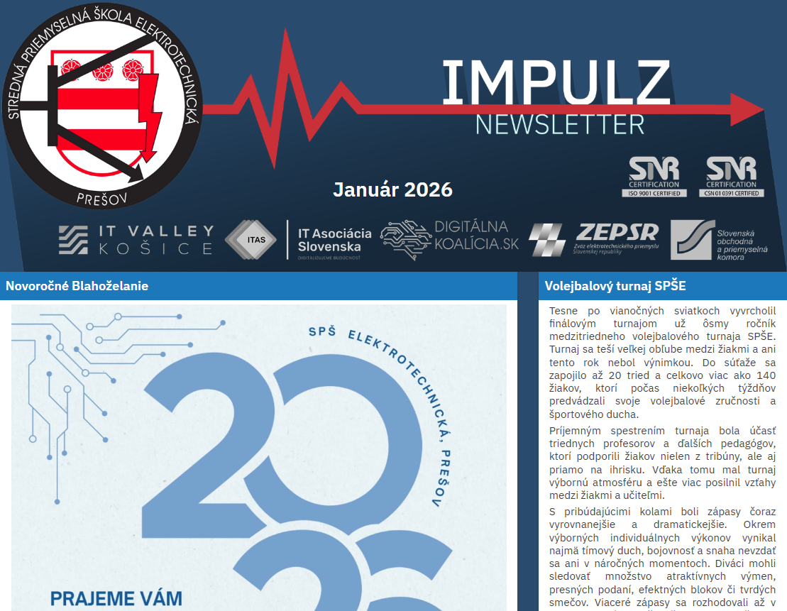 Prostredníctvom ďalšieho komunikačného kanála Vám chceme prinášať informácie o dianí v škole, zo života žiakov a pedagógov školy, práce vedenia školy, metodických útvarov školy, Združenia rodičov SPŠE o. z., Rady školy, Školského parlamentu, ale aj informácie zo života školského internátu. Jednoducho v newsletteri Impulz máte možnosť dostať od nás prehľad o dôležitých akciách a udalostiach školy. Budeme radi, ak sa web stránka a newsletter Impulz skutočne stanú „srdcom“ elektrikárskej komunity a priblížia Vám najnovšie udalosti.