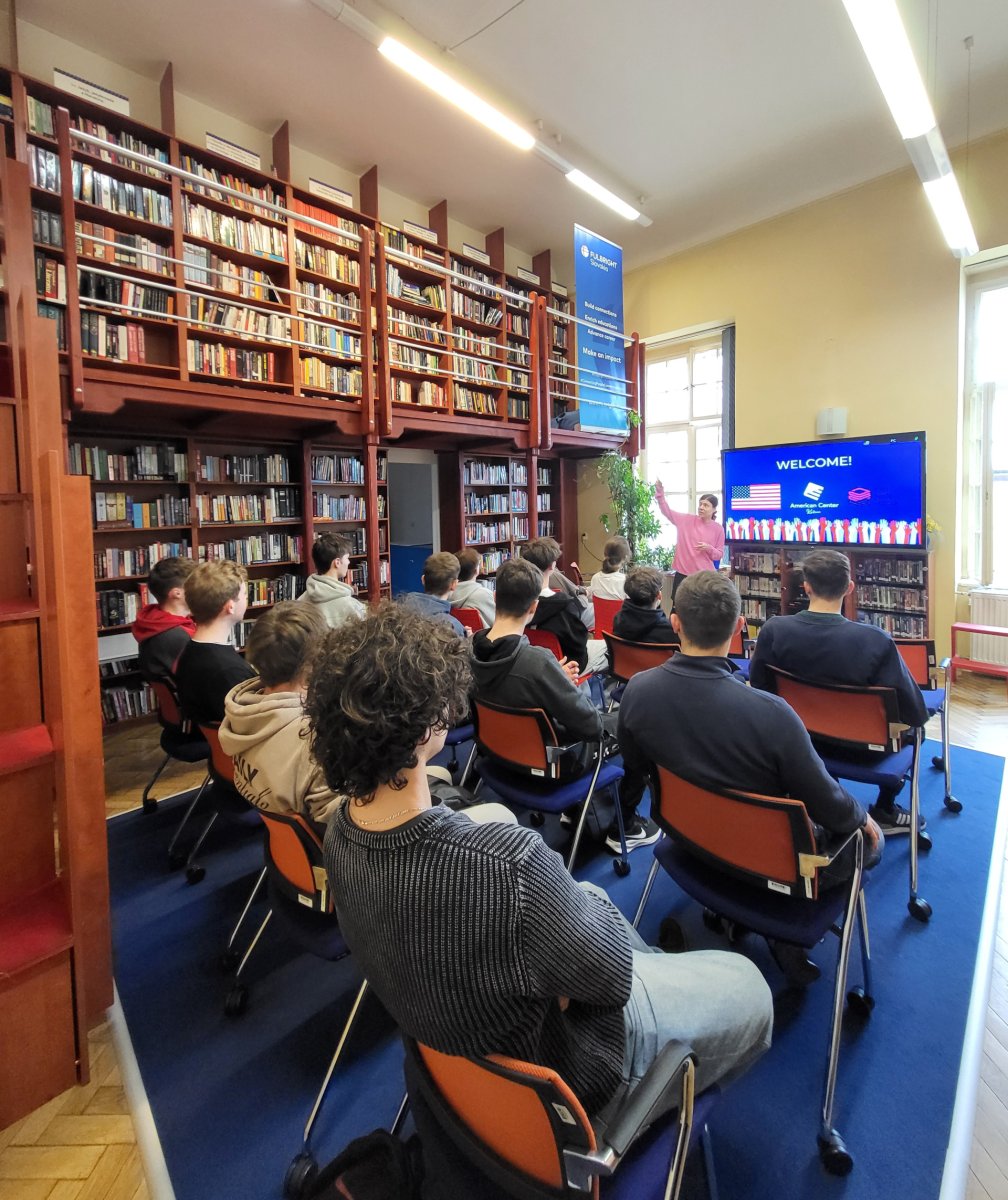 Po príchode boli študenti privítaní v študovni, kde bol pre nich pripravený odborný, a zároveň interaktívny program vedený v angličtine. Súčasťou programu bola prezentácia zameraná na americkú kultúru, vzdelávací systém, možnosti výmenných pobytov v USA a poradenstvo v oblasti štúdia v zahraničí. Žiaci mali možnosť oboznámiť sa s učebnicami určenými na prípravu na medzinárodné skúšky (TOEFL, SAT, ACT, GRE, GMAT) ako aj s ponukou filmových DVD, beletrie a odbornej literatúry dostupnej na zapožičanie. Počas programu sa aktívne zapájali do diskusie, kládli otázky a rozvíjali svoje komunikačné zručnosti v anglickom jazyku.